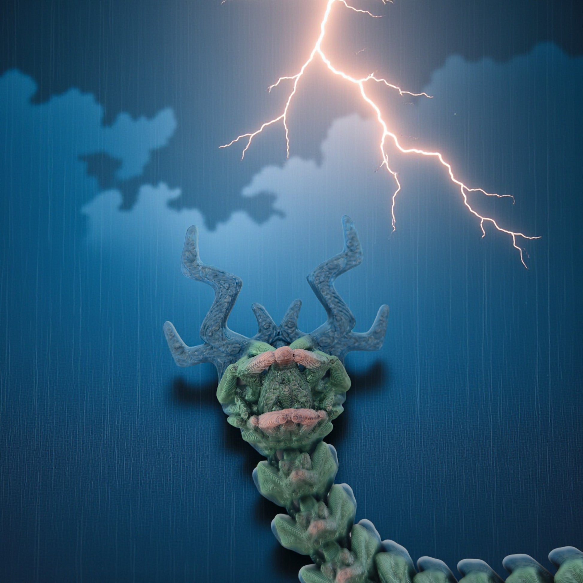 Crackling with power and wrapped in swirling clouds, the Storm Dragon commands the skies with thunderous majesty. Lightning dances along its wings as dark scales shimmer with flashes of silver and electric blue — a living tempest born of wind and fury.